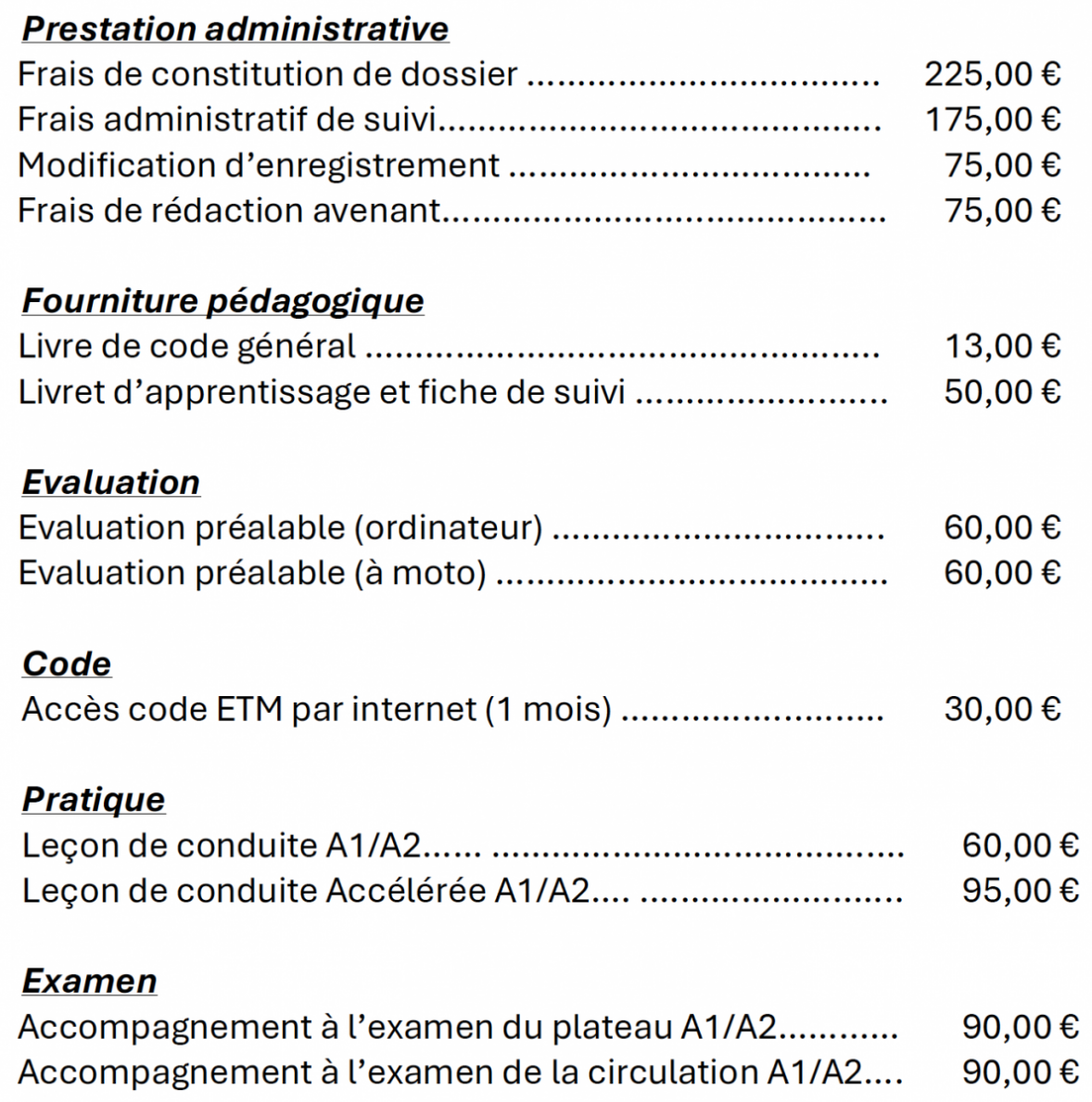 FORFAIT PERMIS A1 / A2