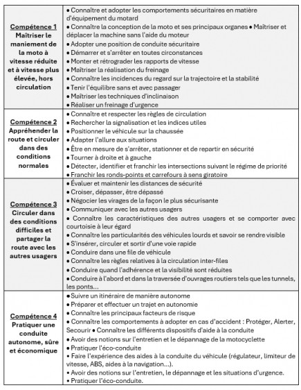 L’objectif général de la formation est d’amener tout conducteur de motocyclette à la maîtrise de compétences en termes de savoirs, savoir-être, savoir-faire, et savoir-devenir. Le programme de formation se veut une vue d’ensemble des compétences qu’un conducteur responsable doit acquérir pour ne pas mettre sa sécurité et celle des autres en danger.